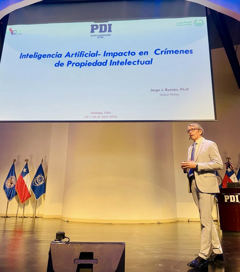 Así, el Dr. Román fue el encargado de transmitir la experiencia de la Policía de Dubai en dos relevantes temas “Inteligencia Artificial y el Impacto en la Propiedad Intelectual” y “Desafíos de la Propiedad Intelectual, Fraude Financiero en el Metaverso”, en los cuales, junto con compartir los aprendizajes de la Policía de Dubái y su unidad especializadas en estas materias, destacó la importancia de la participación de la comunidad, aumentar el impacto de la propiedad intelectual mediante la sensibilización y la educación, fomentar la cooperación internacional y mejorar el ecosistema de este ámbito de acción”.